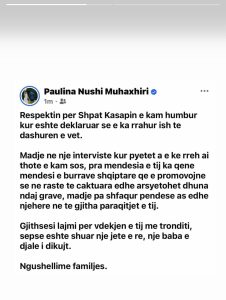 Megjithatë, gazetarja thekson se lajmi për vdekjen e tij e ka tronditur, sepse, siç shprehet ajo, “është shuar një jetë e re, një baba dhe një djalë i dikujt”. Ajo i ka shprehur ngushëllime familjes së Kasapit./Kosovarja/